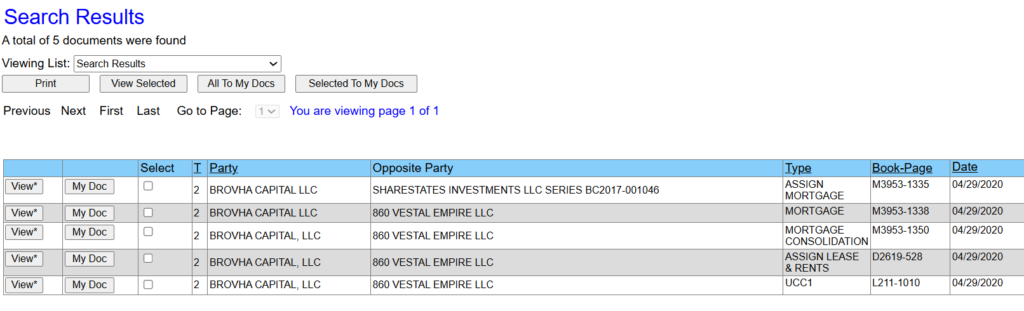 A review of the online documents confirm that Brovha Capital LLC took over the defaulted mortgage ($439,000) from Sharestates. And then on the same day, this LLC “allegedly” loaned another $859,000 to the same entity that defaulted on the Sharestates mortgage they just took over.