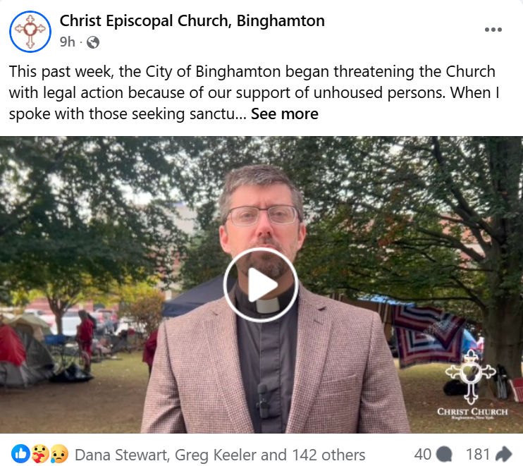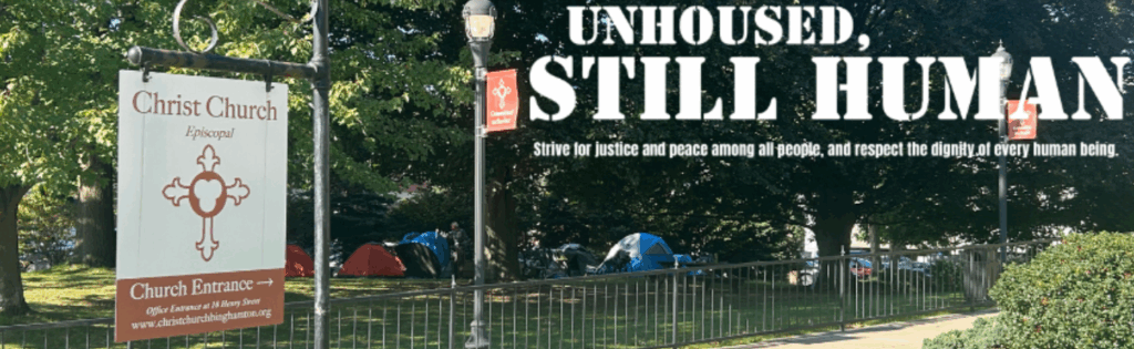 If you haven’t noticed, Christ Episcopal Church in downtown Binghamton (across from Lost Dog Café) has been providing its grounds for homeless folks to pitch tents and its facilities for hygenic needs and to eat meals together. Their campaign, “Unhoused, Still Human,” is an inspiring expression of faith and love for all.