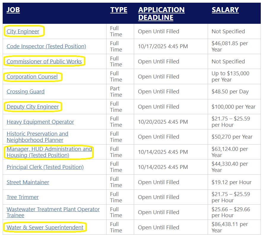 The Deputy Engineer’s position is also listed as VACANT in Jared’s 2026 proposed budget. Kraham is also searching for a new candidate to manage the millions of dollars in federal housing funds Binghamton receives annually to strengthen our disinvested neighborhoods and help our vulnerable residents. Both senior positions are posted on the City’s website with other executive positions. Did you know we were without a full-time Water and Sewer Superintendent? Join the club.